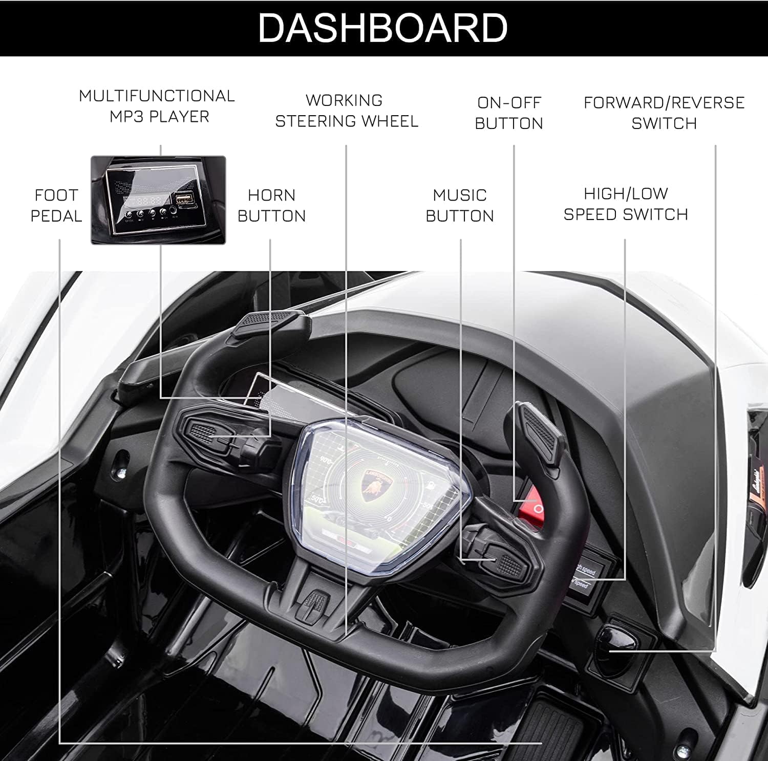 Un carro con licencia oficial Lamborghini, que combina lujo, seguridad y diversión. Incluye tablero LED, conexión Bluetooth y bocina integrada, para que los pequeños disfruten una experiencia real de conducción.